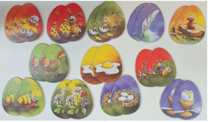 各自鶏のコマを選び尻尾を嵌め運動場タイルに置きます。
